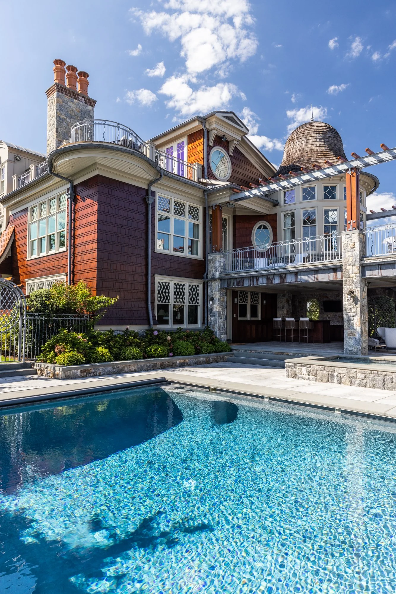 A Shingle and Stone style house, located in Old Greenwich, overlooking Long Island Sound. For this client, we acted as both Architect and General Contractor in order to bring the concept to reality. It features a pool, terraces, beautifully accompanied library and kitchen, as well as a custom elevator and numerous handmade ironworks.